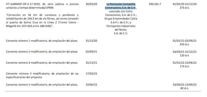 El 30 de marzo de 2020, la Peninsular –en alianza con Caltia y Ferroviarias Industriales del Norte– recibió la licitación del Ferrocarril del Istmo de Tehuantepec, S.A. de C.V por 939 millones 561 mil pesos para la "Corrección en 56 km de curvatura y pendiente y rehabilitación de 146.3 km de vía férrea, así como conexión al puerto de Salina Cruz en la Línea Z (Tramo Ubero - Mogoñé km 137+564 al km 186+046)". La Auditoría Superior de la Federación no halló irregularidades en esta obra ya concluida.