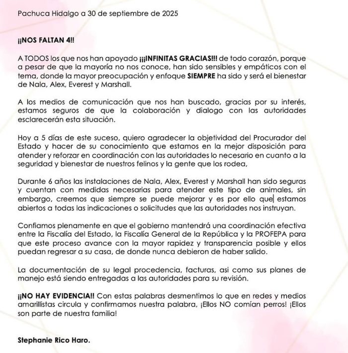 “Durante 6 años las instalaciones de Nala, Alex, Everest y Marshall han sido seguras y cuentan con medidas necesarias para atender este tipo de animales, sin embargo, creemos que siempre se puede mejorar y es por ello que estamos abiertos a todas las indicaciones o solicitudes que las autoridades nos instruyan”, escribió.