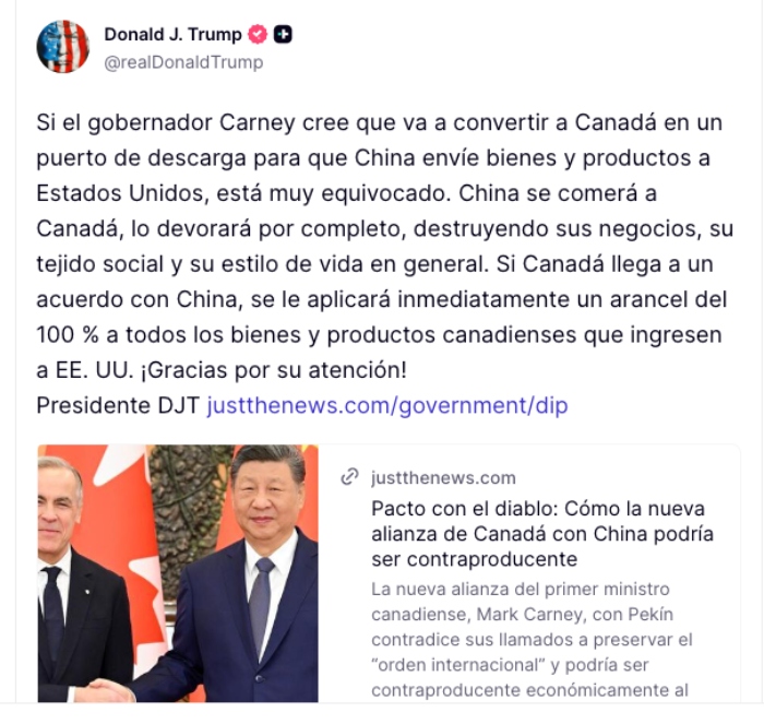 Ciudad de México, 24 de enero (SinEmbargo).- El Presidente Donald Trump amenazó este sábado al Primer Ministro de Canadá, Mark Carney, con imponer un arancel del 100 por ciento a todos los bienes y productos canadienses que ingresen a Estados Unidos si llega a un acuerdo comercial con China y advirtió que no permitirá que Pekín se apodere de su vecino del norte.