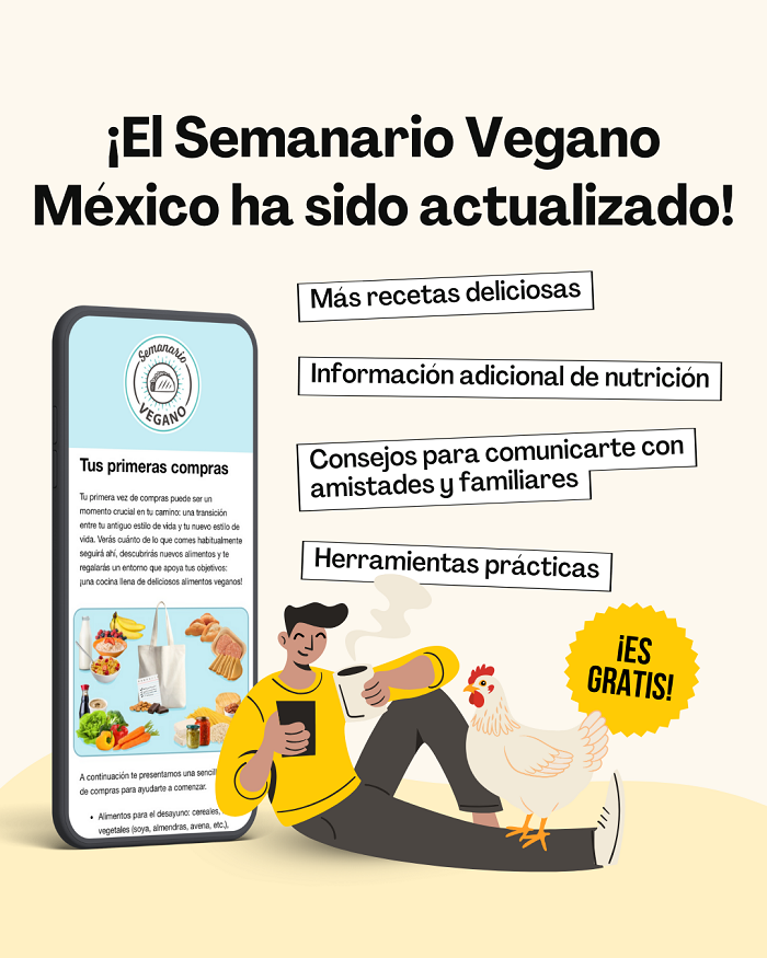 El camino hacia la alimentación basada en plantas no tiene que ser perfecta y definitivamente transitarlo en solitario lo puede volver más retador. Es por eso que en Vegan Outreach hemos creado un programa gratuito en línea llamado Semanario Vegano, cuyo propósito es acompañarte en este nuevo camino, brindándote información nutricional confiable, elaborada por un nutriólogo certificado, así como herramientas prácticas, recetas deliciosas de platillos que ya disfrutas en su versión vegana y apoyo continuo, para que avances paso a paso y a tu propio ritmo.