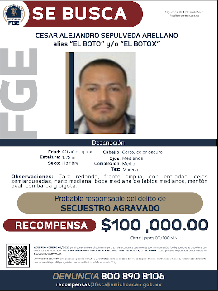En Michoacán, “El Bótox” es considerado uno de los principales generadores de violencia. Autoridades estatales lo vinculan con al menos siete órdenes de aprehensión por delitos que incluyen homicidio, extorsión agravada y tentativa de homicidio. El asesinato de Bernardo Bravo, ocurrido en octubre de 2025, fue uno de los casos más graves que se le atribuyen y que sacudió a la región de Tierra Caliente, históricamente marcada por la violencia criminal.