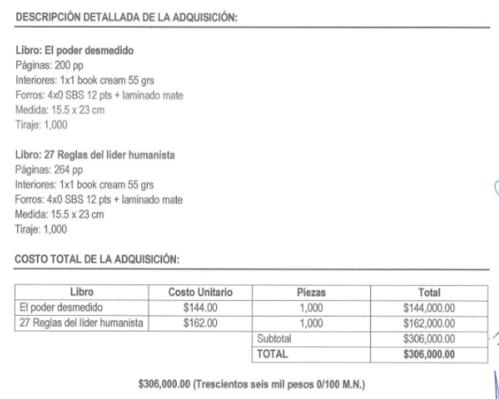 En la revisión al gasto panista del último trimestre de 2025 se ubicó un contrato con la empresa Producciones Sin Sentido Común, por un monto de 306 mil pesos para la compra de 2 mil copias de dos libros.