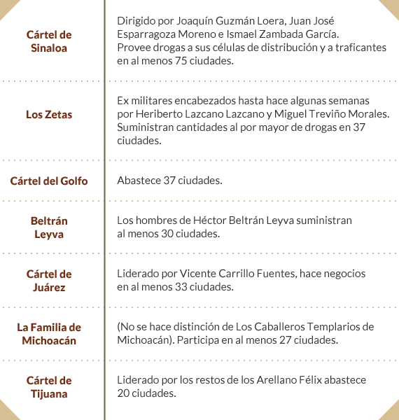 De los siete principales cárteles mexicanos imbuidos en el negocio de las drogas en EU, “el Cártel de Sinaloa es el dominante y su extensa red de distribución suministra drogas a todas las regiones de los Estados Unidos”.