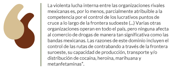 "No hay organizaciones de traficantes en posición de desafiar el dominio de los carteles mexicanos de la cocaína al por mayor, la heroína, la marihuana, la metanfetamina y su distribución en los Estados Unidos, sobre todo en el suroeste, sureste, los Grandes Lagos, Centro-Oeste y las regiones del Pacífico (...) Ampliarán aún más sus actividades en Nueva Inglaterra, Nueva York y Nueva Jersey, el Atlántico Medio, Florida y El Caribe a expensas de las organizaciones colombianas. Los grupos dominicanos en los mercados del Este, antes suministrados en su totalidad por los colombianos, ahora lo son por los mexicanos".