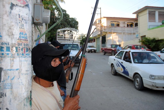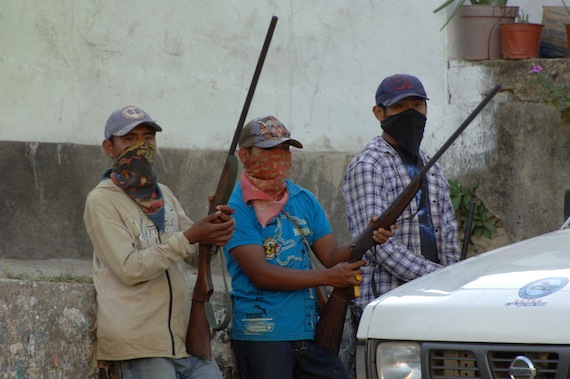 Los integrantes de la Policía Comunitaria resguardan los tramos carreteros con armas cortas, cubiertos del rostro, para poner a salvo a sus familiares, según dieron a conocer a los medios de comunicación, quienes recorrieron la zona.