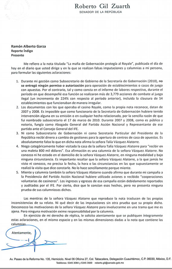 “El senador del PAN, Roberto Gil Zuarth, no es el único panista cercano al ex mandatario involucrado en esta red criminal que operó para que el casino Royale de Monterrey funcionar a ilegalmente. El abogado Julio Esponda Ugartechea, amigo cercano de Calderón y socio del despacho del exsecretario de Gobernación, Fernando Gómez Mont, enfrenta la acusación de haber recibido dinero producto de los casinos ilegales”, dice la publicación.