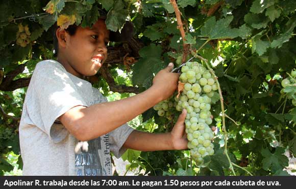 Los surcos rebosantes de racimos de uva de mesa se aprecian, son cientos y en uno de ellos se interna Apolinar. Sus manos son pequeñas, perfectas para atravesar el arbusto y las delgadas ramas de los enanos árboles de la fruta. El niño sabe cómo hacerlo, aprendió primero a pizcar, antes que leer y escribir. Se sienta sobre uno de los surcos de tierra, arranca un racimo y come algunos frutos, respira un poco y se enjuga el sudor de la frente. Su cabello está mojado y el pequeño permanece sin hablar, observa un poco alrededor antes de retornar a la pizca.