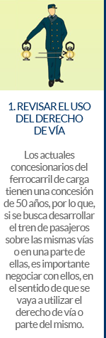 Detalla que los actuales concesionarios del ferrocarril de carga tienen una concesión de 50 años, por lo que, si se busca desarrollar el tren de pasajeros sobre las mismas vías o en una parte de ellas, es importante negociar con ellos, en el sentido de que se vaya a utilizar el derecho de vía o parte del mismo.