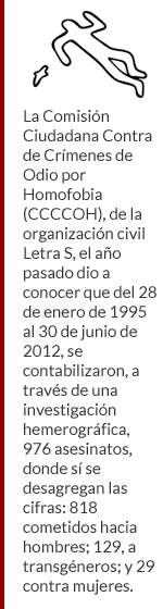 Sin embargo, la Comisión Ciudadana Contra de Crímenes de Odio por Homofobia (CCCCOH), de la organización civil Letra S, el año pasado dio a conocer que del 28 de enero de 1995 al 30 de junio de 2012, se contabilizaron, a través de una investigación hemerográfica, 976 asesinatos, donde sí se desagregan las cifras: 818 cometidos hacia hombres; 129, a transgéneros; y 29 contra mujeres.