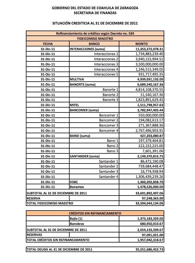 La página, sin embargo, no agrega datos posteriores a 2011. Durante 2012 hubo nueva deuda, contratada por el actual Gobernador Rubén Moreira, para hacer frente al financiamiento y pago de intereses de los pasivos que su hermano, Humberto, adquirió en condiciones poco claras.