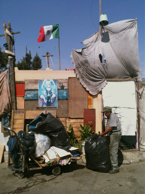 Su casa, como todas las demás, está decorada con lo que rescata de la basura, como un cuadro de caricatura japonesa o la bandera mexicana que ondea sobre el techo.
