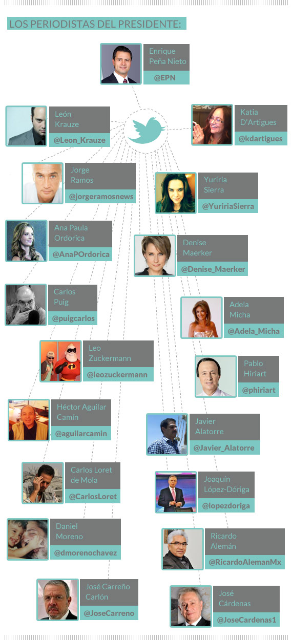 Pese a que en la cuenta de @EPN el Presidente Peña Nieto no sigue a ninguno de sus colegas latinoamericanos, sí se da el tiempo de seguir a personajes destacados de distintos medios en México, como el periodístico, el deportivo e incluso los espectáculos.