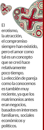 Por su parte, Vanesa Maldonado Macedo, socióloga de la UNAM, especialista en género, manifiesta que el amor y la elección de pareja como la conocemos es muy reciente, ya que los matrimonios eran "negocios, intereses familiares, políticos, económicos y sociales. Cuestión que enfatiza Tere Díaz, psicoterapeuta familiar y de pareja de la organización Psicoterapia La Montaña, "antes hablar de ello no era ni tema; el erotismo, la atracción, el compromiso siempre han existido, pero el amor como tal es un concepto que se creó hace relativamente, poco tiempo. Hoy pocas personas se emparejan sin estar enamoradas; muchas eligen con quién relacionarse porque quieren y porque les satisface".