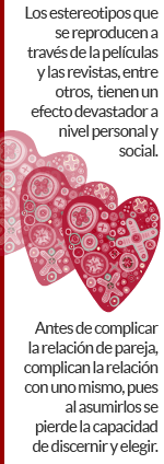 La socióloga señala que los estereotipos antes de complicar la relación de pareja, complican la relación con uno mismo, pues al asumirlos se pierde la capacidad de discernir y de elegir, "estás absorto en tener que ser así; no es si puedo o quiero, si me gusta o no. Debo responder cómo se establece, porque todos lo hacen y eso espera el mundo de mí, porque cuando uno está en pareja o se casa está completo y feliz; es lo mejor que te puede pasar y si ya tienes hijos, prácticamente ya te puedes morir, tu vida está hecha, realizada", ataja.
