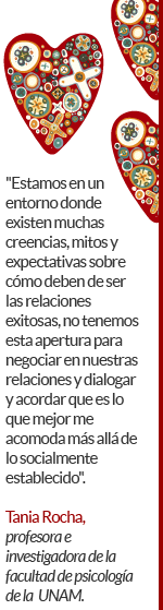 Aunado a ello la entrevistada sugiere desarrollar una mirada flexible: "Estamos en un entorno donde existen muchas creencias, mitos y expectativas sobre cómo deben de ser las relaciones exitosas, no tenemos esta apertura para negociar en nuestras relaciones y dialogar y acordar que es lo que mejor me acomoda más allá de lo socialmente establecido", lamenta.