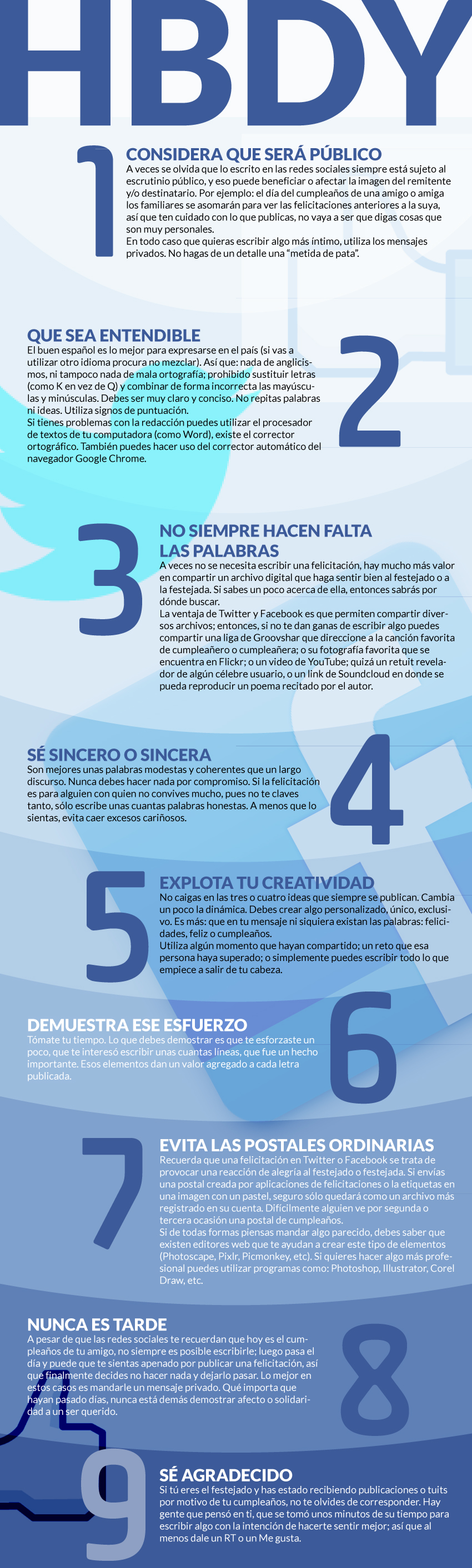 Por otra parte, hay casos donde las felicitaciones sólo se reducen a: “HBD”, “feliz cumpleaños”, “pásala bien”, “felicidades”. Es decir, como si sólo existieran unas cuantas ideas que funcionan para publicar en Twitter (con más de 200 millones de usuarios) o Facebook (más de mil millones de usuarios).