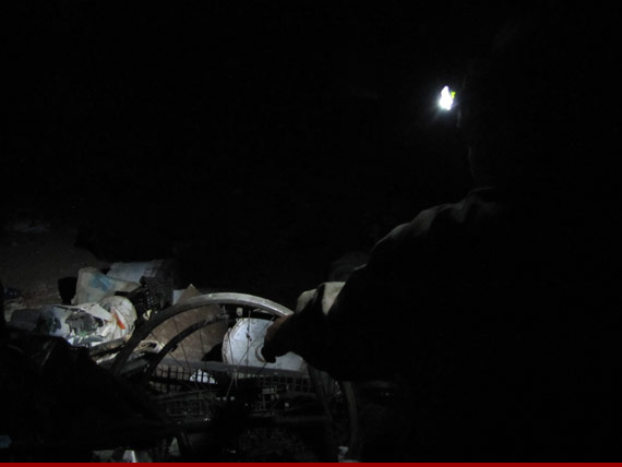 Cinco luces revolotean a lo lejos. Una de ellas toma distancia del resto y se acerca. La luz proviene de un foco minero de neón que porta Pedro sobre su cabeza. Lo usa para esculcar entre los desechos de basura de este Culiacán en crecimiento.