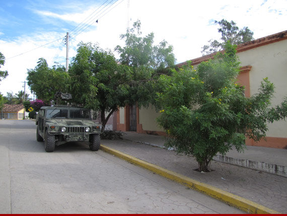 Los portones de las casas antiguas de La Noria, Mazatlán, portan un candado macizo. Un par de niños juega en medio de la calle principal sin temor a ser atropellados. El único vehículo que se atreve a rodar por el lugar es de color verde olivo y pertenece a un grupo de militares que hacen presencia en la zona.