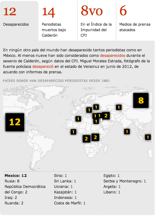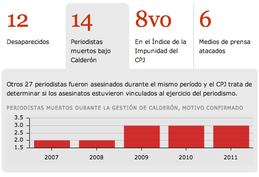 Ciudad de México, 14 de feb (SinEmbargo).– El Comité para la Protección de los Periodistas (CPJ) revelo este día que la gestión de Felipe Calderón Hinojosa, de diciembre de 2006 a diciembre de 2012, ha sido uno de los periodos más violentos para la prensa que se haya registrado en el mundo.