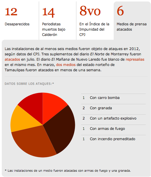 De acuerdo con su reporte anual, indica que en México, mientras las fuerzas armadas luchaban contra los cárteles de droga y éstos a su vez peleaban entre sí, la prensa fue el el objetivo de la violencia por parte del crimen organizado y funcionarios corruptos que buscaban el control informativo.