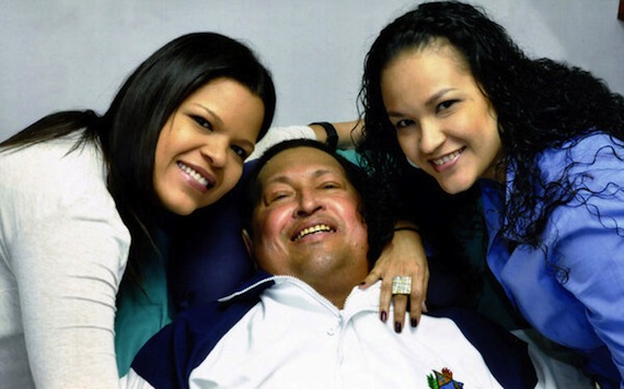 El Presidente, vestido con su habitual ropa deportiva de la Academia Militar, aparece flanqueado por dos de sus hijas en las imágenes, tomadas el jueves por la noche, según Arreaza.