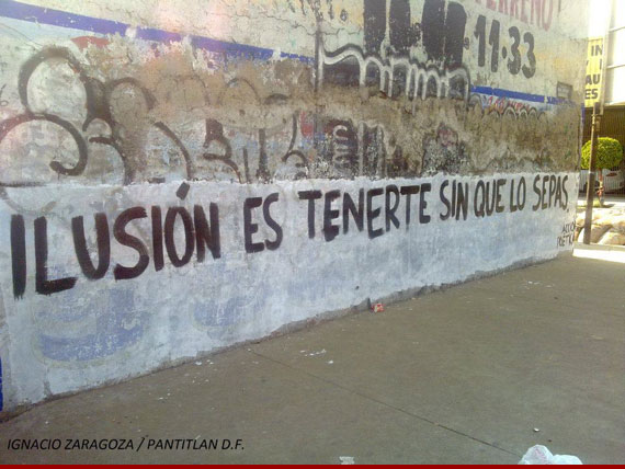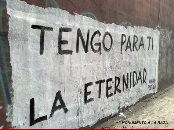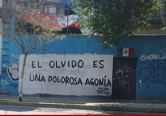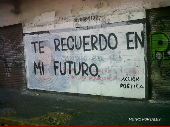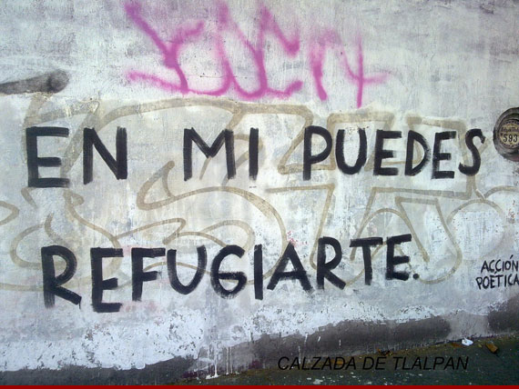 Acción Poética DF pinta a la luz del día. Ese domingo bastaron unos minutos para que una pared sucia, llena de rayones y grafiti mal hecho se transformara, y quedara llena de palabras y mensajes: “Me das luz y estás iluminada”. La pinta se realizó rápidamente ante la mirada de unos “policletos” que merodeaban el lugar, si bien no hubo problemas en esa ocasión, los jóvenes comentan que la policía los molesta mucho: “Por cada cinco bardas pintadas, en tres casi siempre llegan, es un poco frustrante en ese aspecto”; pese a ello, aclaran, jamás han intentado extorsionarlos.