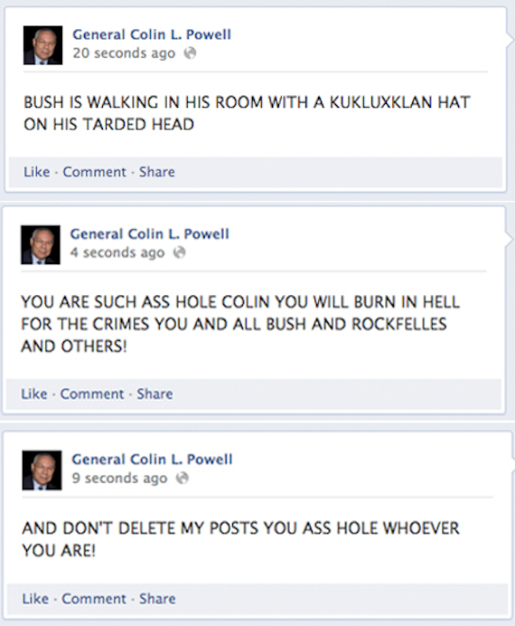 Pero a diferencia de los ataques anteriores de Guccifer, que eran intrusiones en las cuentas de correo electrónico con sus consecuentes violaciones de privacidad, la incursión en la cuenta de de Facebook de Powell fue poco más que un acto de vandalismo.