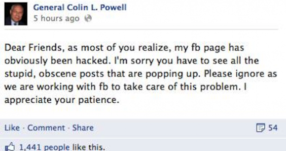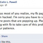 Con la ayuda de Facebook, Powell recuperó el control de su página en la tarde del lunes y emitió una disculpa por los "mensajes estúpidos y obscenos" escritos por el intruso.
