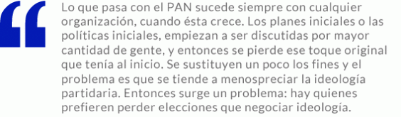“Pero, ¿para qué sirve tener una ideología muy fuerte si no la puedes llevar a cabo, porque no ganas puestos de elección? Es una ecuación difícil de resolver: Si somos muy fieles a la historia, política y propuestas del partido, resulta que éste no crece y si crece, tiende a debilitarse ideológicamente”.