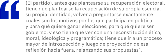 “Madero dice, en 2000 ganamos la elección con 100 mil afiliados y en 2012 la perdimos con 2 millones. Entonces, de alguna manera lo que está mostrando es que él está por un partido más chico, ideológicamente mucho más firme, programáticamente mucho más coherente, pero lo cierto es que así no se ganan las elecciones”, concluye.