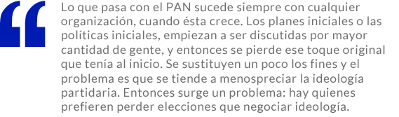 –El PAN abandonó la capacitación ideológica y doctrinaria desde que le creímos a (Carlos) Castillo Peraza que habíamos logrado una victoria cultural y qué lejos estamos de haberla logrado. En realidad, la única cultura que ha imperado es la priista y la lógica arribista, y ya nos dimos cuenta que esa lógica no sirve a la ética del PAN, a quien refuerza es al PRI. El PAN tiene que volver a hacer una apuesta por la formación de ciudadanía, por la formación ideológica y doctrinal, a través de capacitación permanente. A mucha gente del partido usted le pregunta, ¿quién fue Manuel Gómez Morín? (el fundador del partido, nacido en Batopilas, Chihuahua) y no sabe.