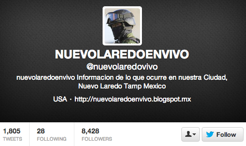 Emite información constante de lo que acontece en Nuevo Laredo, Tamaulipas, con los HT #SDRLAREDO, #LAREDOFOLLOW y #NUEVOLAREDO.