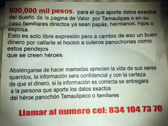 “600.000 mil pesos para el que aporte datos exactos del dueño de la página de “Valor por Tamaulipas” o en su caso familiares directos ya sean papás, hermanos o hijos o esposa”, dice el texto.