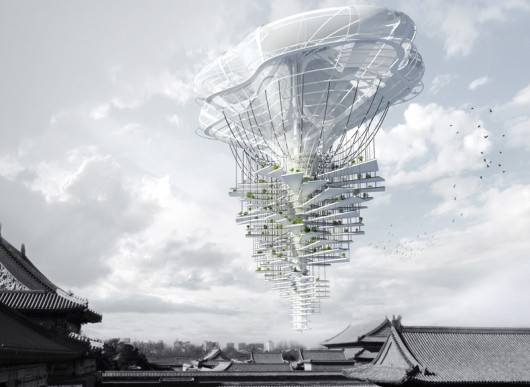 Finalmente, el tercer puesto lo obtuvo la propuesta de los arquitectos chinos Ting Xu y Yiming Chen, quienes diseñaron un rascacielos flotante, cuya estructura se mantiene a suspendida sobre la tierra gracias a una gran tapa rellena de helio que se brinda energía solar a sus hélices.