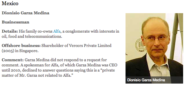 Entre los primeros 29 lugares del listado del ICIJ se ubica el regiomontano Dionisio Garza Medina, quien durante 16 años estuvo al frente de Grupo Alfa (conglomerado que se dedica a la producción de aluminio para automotores, derivados del petróleo, autopartes, alimentos y las telecomunicaciones), que está conformado por las compañías Alpek, Nemak, Sigma, Alestra y Newpek.