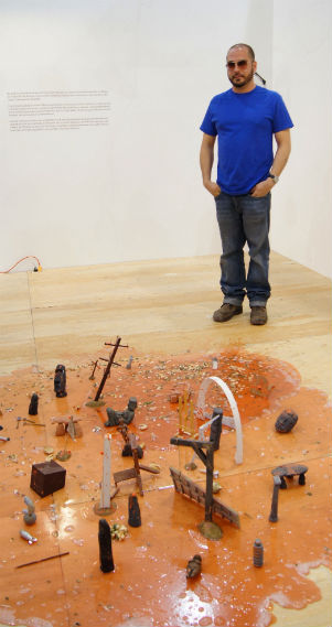 De un charco color naranja aparecen restos de comida que se mezclan con representaciones miniatura de totems, columnas y conocidas figuras prehispánicas. Un charco abyecto al que pocos se atreven a aproximarse, quizás por temor a que, de pronto, cobre vida.