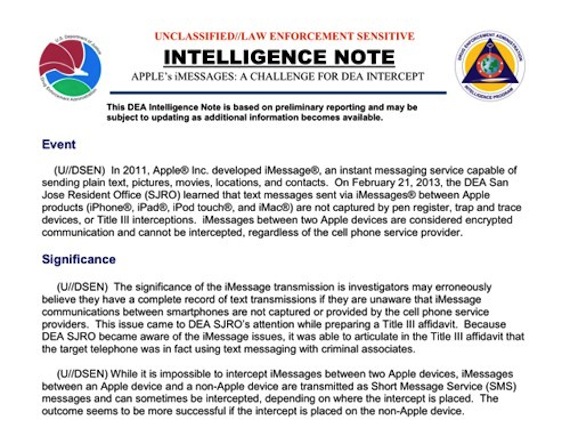 iMessage tiene como función el envío de mensajes gratuitos entre dispositivos Apple, y de acuerdo con un documento interno de inteligencia, la DEA afirmó que "es imposible interceptar los mensajes (iMessage) que se produzcan en dispositivos Apple", según publicó el sitio CNet.