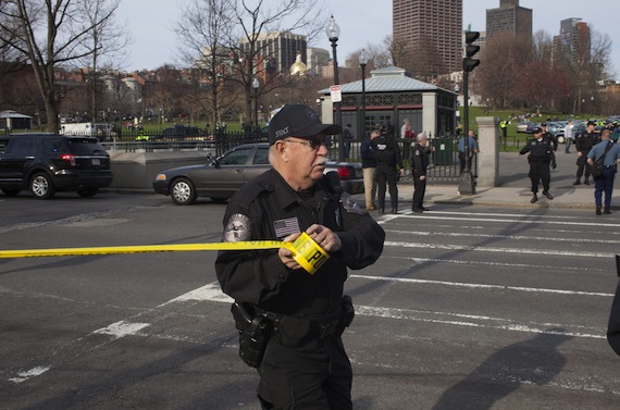 MCX111. BOSTON (MA, EE.UU.), 15/04/2013.- Un policÌa aisla la zona donde se registraron dos explosiones cerca a la lÌnea de meta de la 117 MaratÛn de Boston hoy, lunes 15 de abril de 2013, en Boston, Massachusetts (EE.UU.). Al menos dos personas murieron y un centenar resultaron heridas a causa de la explosiÛn de dos bombas colocadas en la zona donde se corrÌa hoy el maratÛn de Boston, lo que inevitablemente trajo a la memoria de los estadounidenses los atentados del 11 de septiembre de 2001. EFE/DOMINIC CHAVEZ