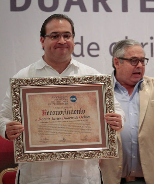 Paradójicamente, la Asociación Mexicana de Editores de Periódicos AC entregó el pasado 2 de abril a Javier Duarte de Ochoa un reconocimiento “a los esfuerzos que ha hecho Veracruz para garantizar el pleno ejercicio de la libertad de expresión”.
