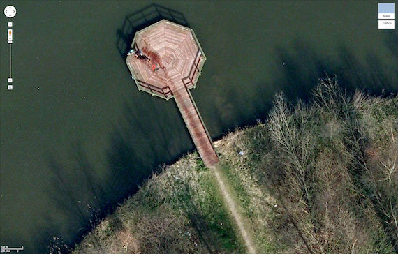 La fotografía fue tomada por satélite y se sitúa en las coordenadas 52.376552, 5.198303, que corresponden a un embarcadero en Almere, Holanda, y en ella se ve un supuesto rastro de sangre que llega hasta un parque después de lo que pudo haber sido un macabro asesinato.