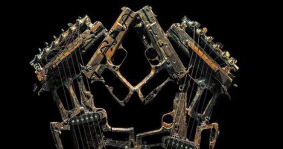 Así, los cargadores de un fusil AK-47 se transforman en el cuerpo de una guitarra eléctrica, los tambores de un revolver en los potenciómetros y varias partes de una ametralladora hacen de mango de este instrumento.