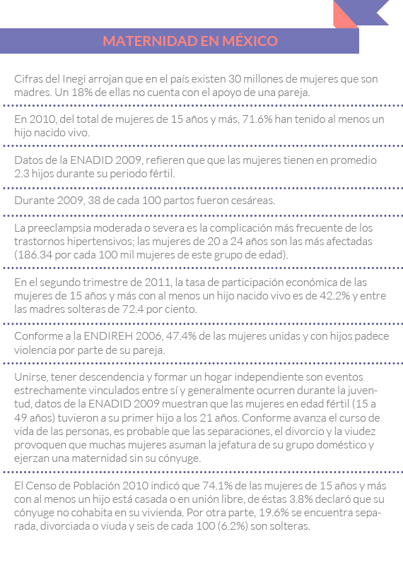 Por su parte la investigadora del Centro de Estudios Sociológicos de la UNAM, Vanesa Maldonado Macedo, comenta que la gestación, la maternidad son elementos que diferencian corporal y biológicamente a las mujeres de los hombres; además, continuamos inmersas en un sistema social que le otorga valor al sexo femenino por su capacidad reproductiva. “Cuando tienen un hijo, muchas mujeres dicen: ‘ya me realicé’, aún hay mucha presión por contraer matrimonio, por parir; hay madres que les dicen a sus hijas: ‘no te quieres casar, bueno, ten un hijo, cómo vas a estar sola’”. Maldonado manifiesta que existe un gran número de mujeres que optan por este rol sin tener plena consciencia de lo que involucra, pues muchas se embarazan porque su método anticonceptivo falló, no se cuidaron y por cumplir con la carga social.