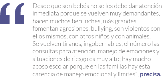 Sus palabras coinciden con las de Rocha quien afirma que la falta de reglas por querer darles lo que no se tuvo en la infancia o por tratar de compensar lo que no se vivió, hace que los padres se vuelvan más permisivos e insiste “es importante decirle a los lectores que si el niño llora, debemos dejar que lo haga un momento, no correr de inmediato a ver qué le pasa o darle algo antes de que lo haga o porque creo que lo necesita. Al acudir enseguida no le dan espacio para que desarrolle un recurso crucial en la vida adulta: tolerancia a la frustración”.