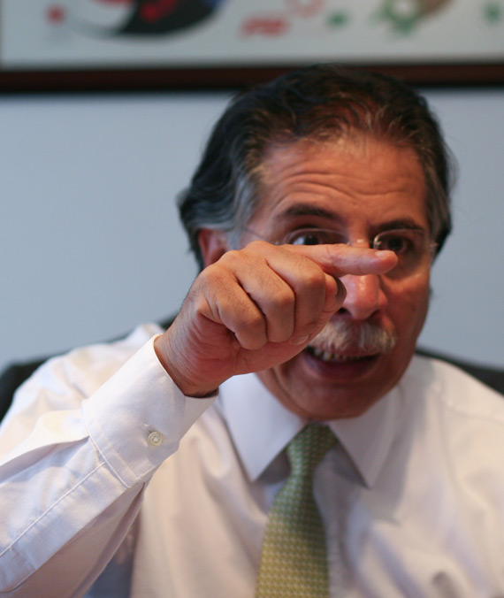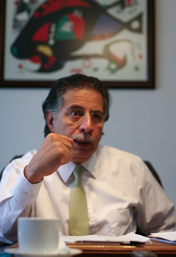 En un cenicero humea un cigarro que recién empezó a fumar y a un lado hay una caja que lo abastece de pañuelos desechables. Ortega toma uno de ellos y se suena la nariz. El día ha sido pesado –dice–: el resfriado que le aqueja es bastante fuerte. Las canas del bigote y de las patillas combinan con la camisa blanca que trae puesta y la corbata de tupidas rayas verde claro zigzagueantes, hacen un pequeño contraste.