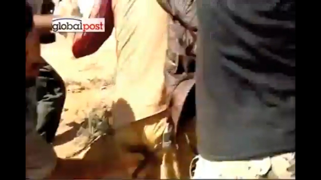 El análisis de un video obtenido por Global Post de un combatiente rebelde que registró el momento en que el coronel Muammar Gadafi fue capturado por primera vez permite confirmar que otro combatiente rebelde, cuya identidad se desconoce, sodomiza al ex líder mientras era sacado de la tubería de drenaje donde se había puesto a cubierto.