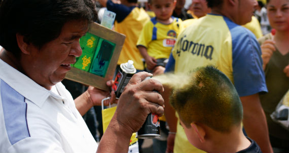 Doña Josefina tiene más de veinte años rociando el cabello de americanistas con color amarillo. Niños y adultos hacen fila para pintarse el pelo y apoyar más a su equipo. Doña José cobra 25 pesos y trabaja sólo dos horas antes del partido. Óscar se pone a su lado para pintar el escudo del local a los recién convertidos “peliamarillos”.