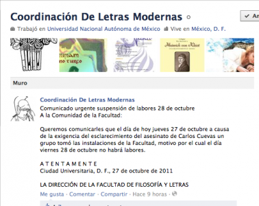 Por su parte, la Facultad de Filosofía y Letras a través de la coordinación de sus distintas carreras envió un correo electrónico a los estudiantes de dicha facultad en el que se les advertía de la suspensión de clases este viernes 28 de octubre por la "exigencia del esclarecimiento del asesinato de Carlos Cuevas".