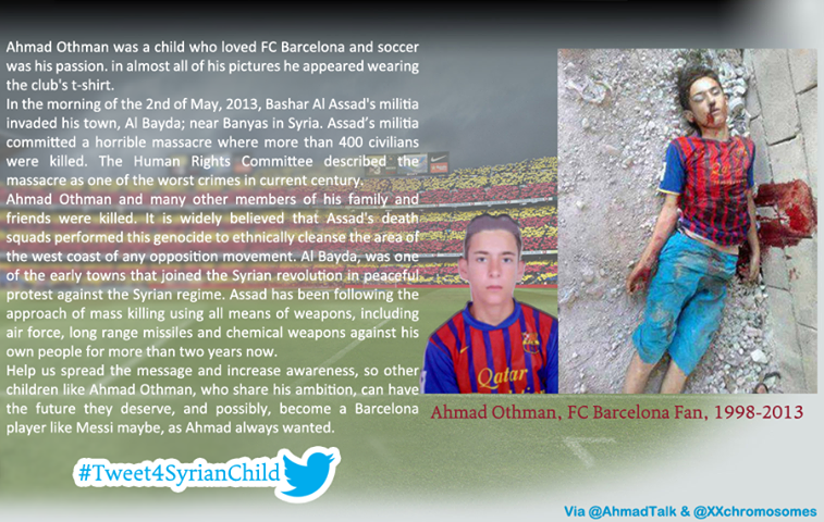 El Cairo, 10 jun (EFE).- La imagen de Ahmad Othman, un adolescente sirio que murió vestido con una camiseta del F.C. Barcelona, se ha convertido en símbolo de una campaña de activistas sirios a través de las redes sociales para protestar contra la muerte de menores en el conflicto.
