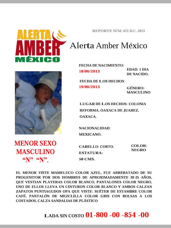 Ciudad de México, 19 de junio (SinEmbargo).– El Gobernador de Oaxaca, Gabino Cué, pidió este día activar la Alerta Amber para localizar a un bebé recién nacido que fue arrebatado de las manos de sus padres en la colonia Reforma de la Ciudad de Oaxaca de Juárez.