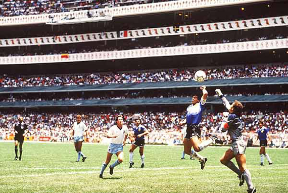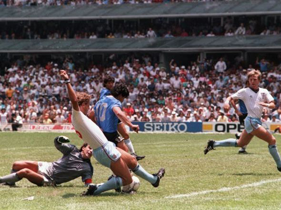 El primer tiempo fue el preámbulo perfecto para alimentar la expectación de un partido que era más friccionado que jugado. Seis minutos después del inicio de la segunda mitad, Diego tomó una pelota afuera del área y dio un pase a Valdano que no supo controlar. El defensa que mal despejó puso el balón en el aire a la altura del punto penal. Peter Shilton, portero inglés, salió con los puños al aire pero con los ojos cerrados. Maradona siguió el curso del esférico. Cuando saltó, Victor Hugo narrador argentino, narró la mano que Diego puso para empujar la redonda a la red. El árbitro tunecino Ali Bennaceur, señaló al centro del campo dando el gol como válido con un montón de ingleses reclamando airados. “Fue un poco la cabeza, un poco la mano de Dios”, declararía Diego después del partido.